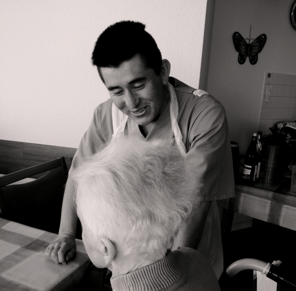 It’s breakfast time at a care home in Neubrandenburg and Zia Hayafi is busy. He is gently moving an elderly woman from her bed into a wheelchair. He should be hurrying – they are waiting for her in the dining room. But he takes his time, moving close to her ear to ask: “Did you sleep well?” She nods.